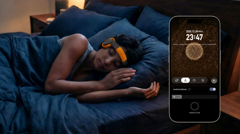 SleepGuide™ gradually guides the user's brainwave activity toward the Sleep Onset Pattern™, acting as a gentle "sleep guide" for the mind. Powered by Real-Time Neural Coupling Modulation (RTNCM™), it plays a personalized combination of AuthenticBeats™ and the user's preferred SubTone™.