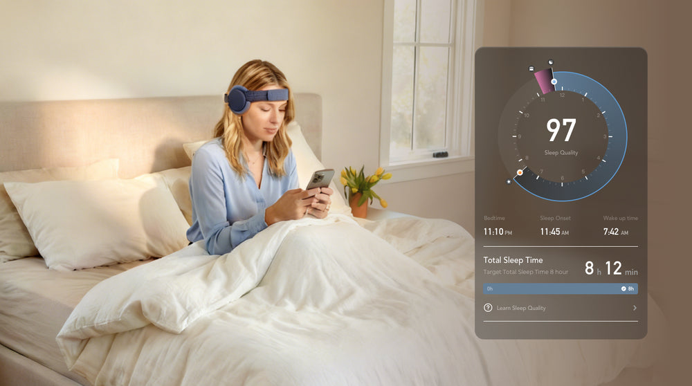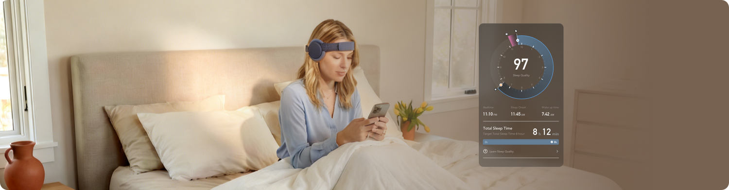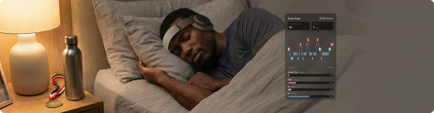 LumiSleep features high-fidelity, four-channel EEG sensors to capture brainwave signals with precision. Supported by PPG and an inertial measurement unit (IMU), it enables accurate, continuous monitoring of brain states and physiological activities.