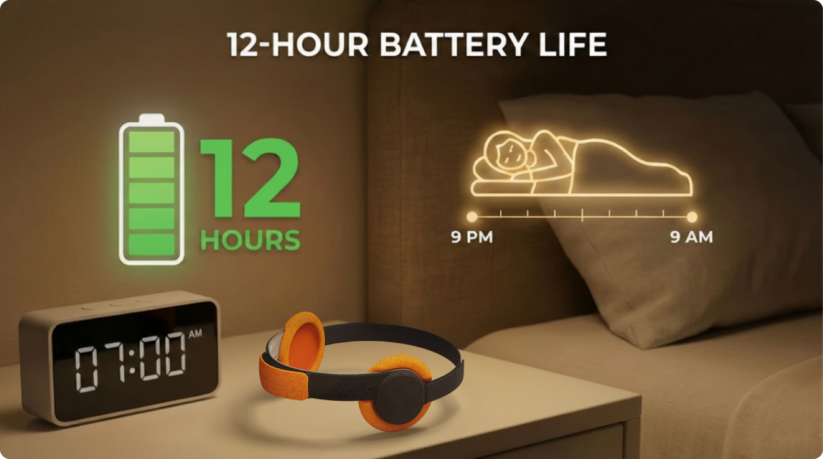 Equipped with a long-lasting internal battery and energy-efficient acoustic module, LumiSleep supports up to 12 hours of continuous use on a single charge, covering 2 hours of SleepGuide™ audio plus a full night of sleep monitoring. Rest easy knowing your device won't power off in the middle of the night.