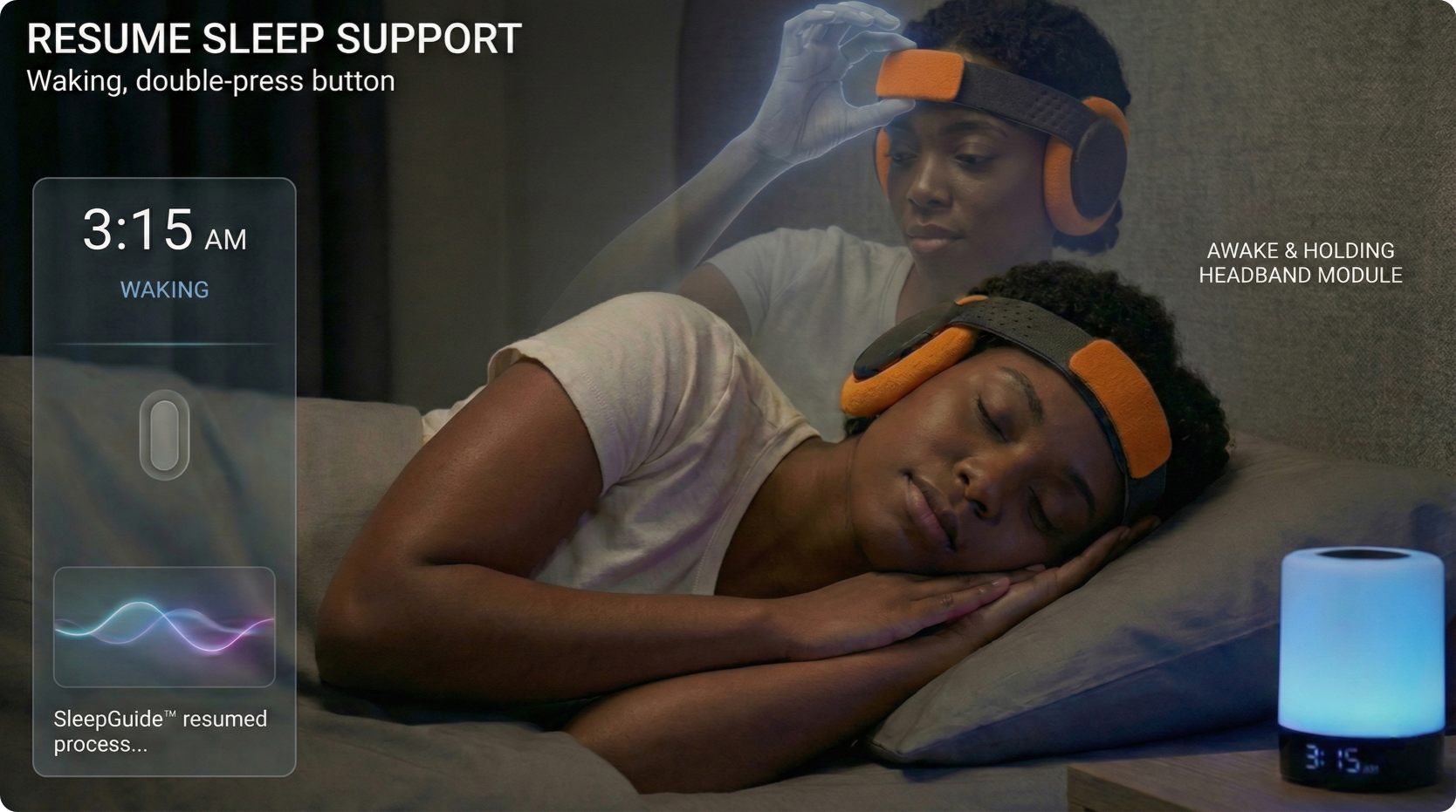 If you wake during the night and need gentle guidance back to sleep, simply double-press the button. Resleep™ Mode instantly resumes SleepGuide™, automatically syncing with your live brainwaves to gently guide you back to sleep.