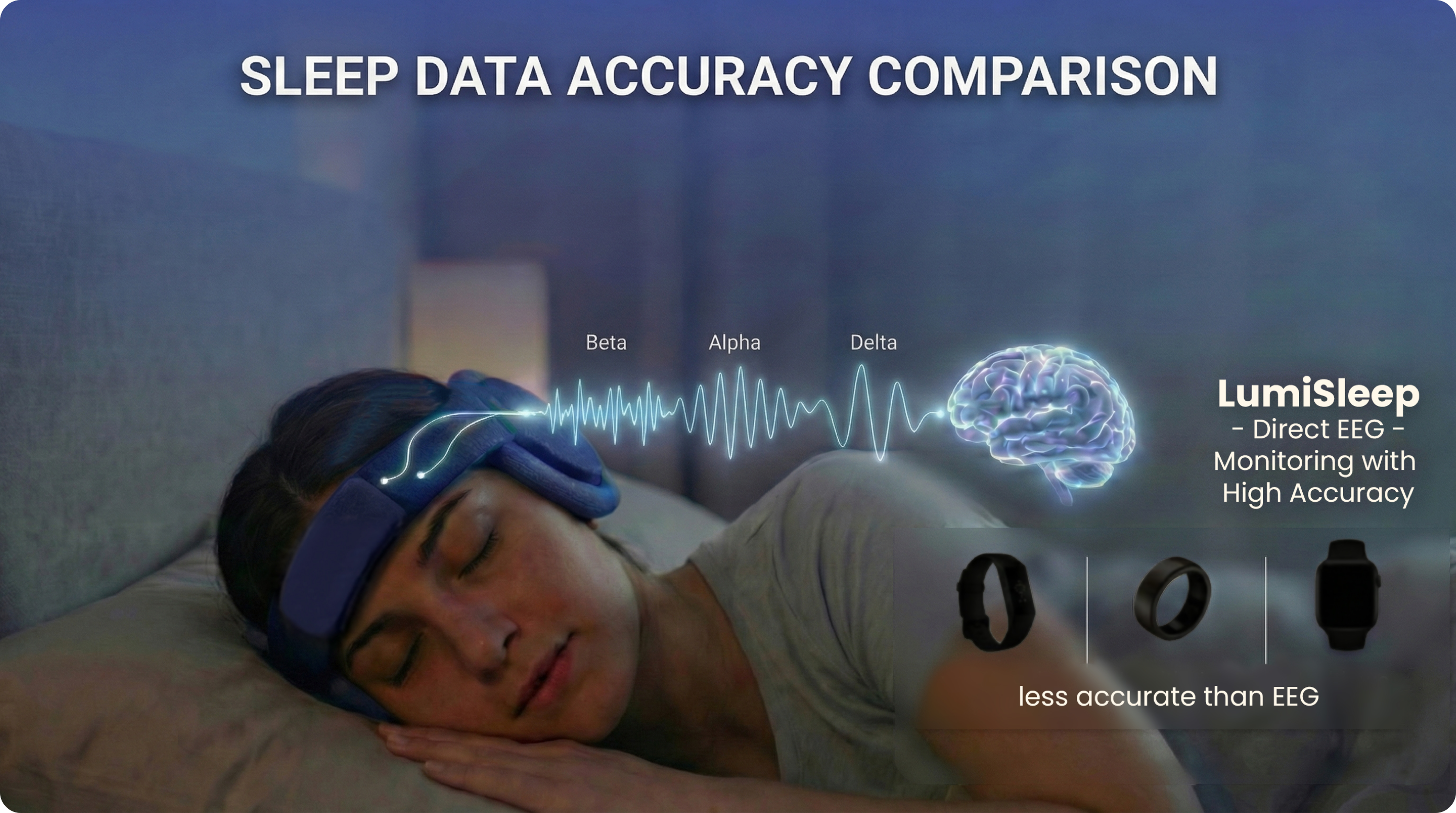 By recording neural activity directly at the source, LumiSleep's EEG sensors deliver significantly more accurate sleep data than smart rings, smartwatches, or wristbands. Not rely on indirect signals, such as heart rate and motion, LumiSleep reads brainwaves themselves — so every insight into your sleep is a true neural measurement, not an estimate.